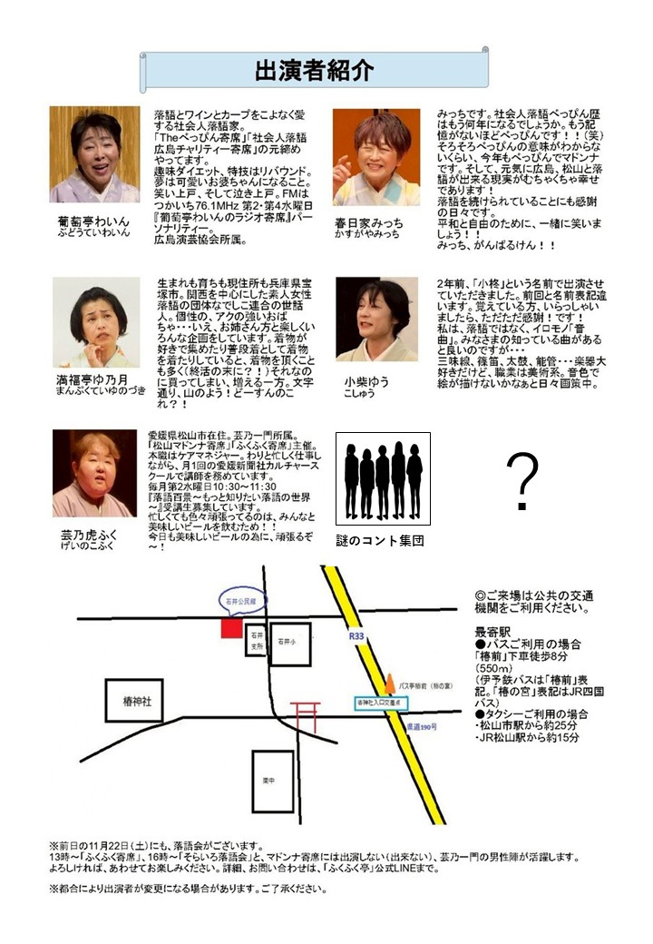 ![]() ![]() 第86回 日本笑い学会四国支部研究会 「第9回 松山マドンナ寄席」 日時:2025年11月23日(日) 開場13:30 開演14:00 (16時終演予定) 場所:石井公民館(松山市居相1丁目8-26) 出演:葡萄亭わいん(広島)春日家みっち(香川)満腹亭ゆ乃月(兵庫)小柴ゆう(東京)芸乃虎ふく(愛媛) のぼ亭こなつ 木戸銭:前売り900円(当日1000円) 笑い学会会員 前売り400円(当日500円) 主催:日本笑い学会四国支部 ※会場及び周辺に専用駐車場はございません。また、付近にコインパーキングもございません。お車でお 越しの場合は、一度、公式LINEかお電話にてお問い合わせください。なるべく、公共交通機関をご利用く ださい。ご不便をおかけします。 ふくふく亭公式LINE https://lin.ee/Gn2bcJ1 予約・問い合わせ:080-2972-2352(佐山) お電話にてお問い合わせの時は、時間帯によっては出れない事もございます。留守電を残して頂ければ 折り返します。また、上記のLINEでも、ご予約承ります。 |